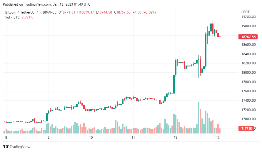 Sau khi chạm mức $ 19.000 vào ngày hôm qua, Bitcoin đã đạt mức giá cao nhất kể từ khi sàn giao dịch FTX sụp đổ. Động thái này chủ yếu được thúc đẩy bởi kỳ vọng Chỉ số giá tiêu dùng (CPI) của Hoa Kỳ cho tháng 12 ở mức 6,5%, nhấn mạnh rằng áp lực lạm phát có thể đã đạt đỉnh vào tháng Sáu.