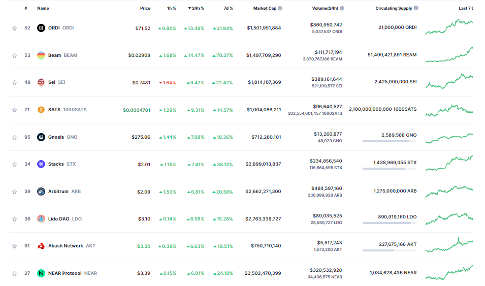 ORDI (ORDI) và Beam (BEAM) là hai dự án hoạt động tốt nhất khi đều tăng trưởng trên 10%. Trong 7 ngày qua, ORDI tăng 32% trong khi BEAM bật lên hơn 70%.