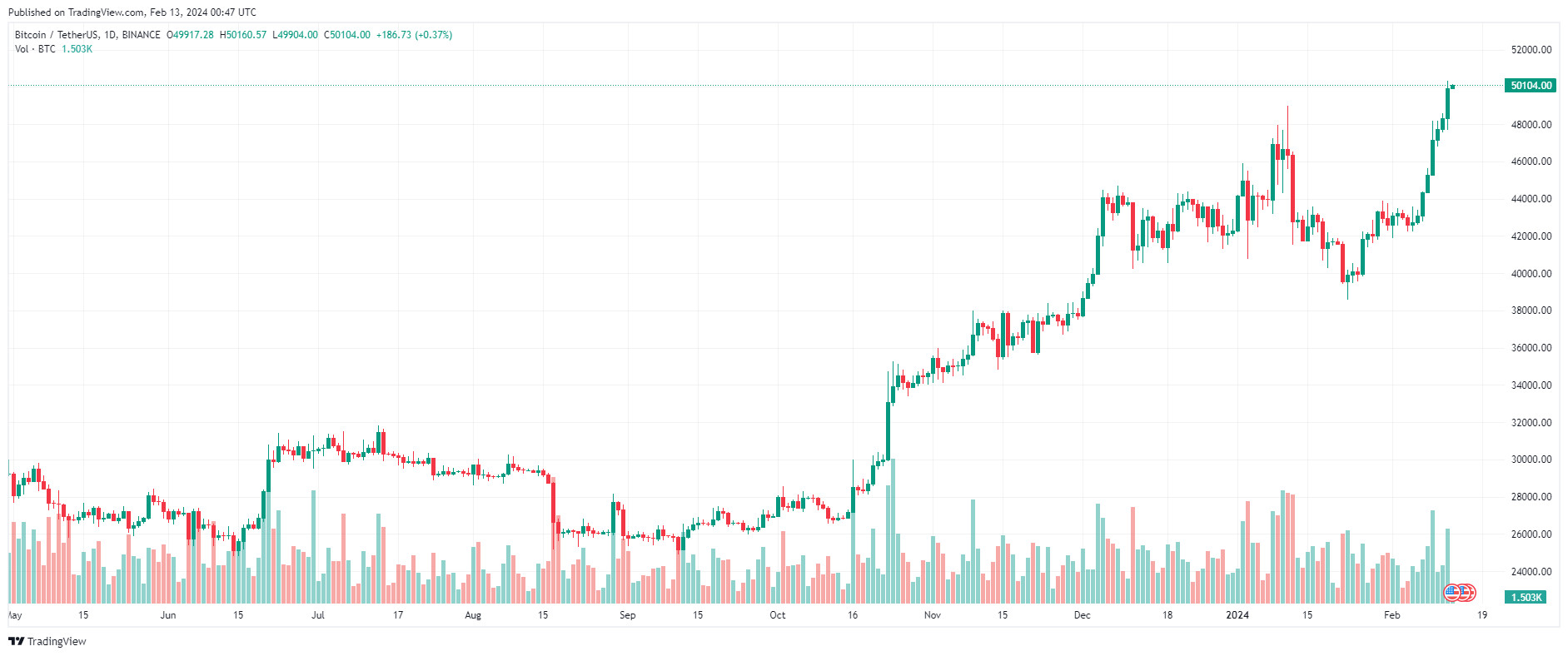 Lần cuối cùng Bitcoin được giao dịch trên $ 49.000 là hơn hai năm trước, vào ngày 28/12/2021, khi nó đạt mức đỉnh tại $ 50.720 trước khi giảm xuống mức đáy $ 15.522 vào ngày 9/11/2022, sau sự cố FTX.