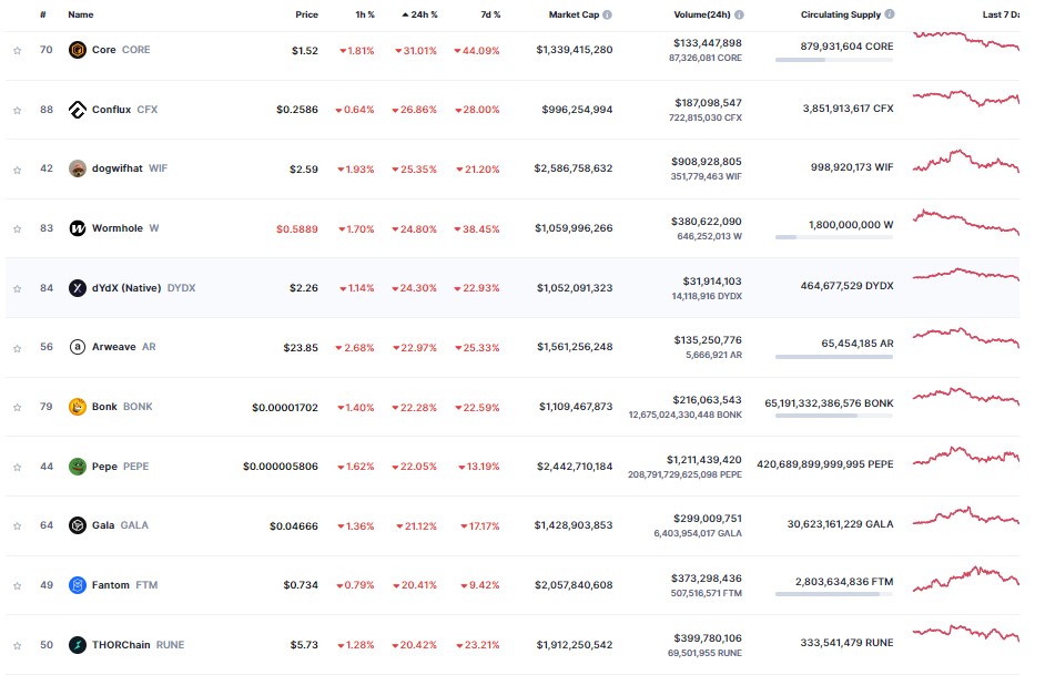 Conflux (CFX), Dogwifhat (WIF), Wormhole (W), dYdX (DYDX), Arweave (AR), Bonk (BONK), Pepe (PEPE), Gala (GALA), Fantom (FTM), THORChain (RUNE), Celestia (TIA), Aptos (APT), Mina (MINA), Filecoin (FIL), SingularityNET (AGIX), Floki (FLOKI), StarkNet (STRK), Jupiter (JUP), Injective (INJ)… bốc hơi hơn 20% giá trị.