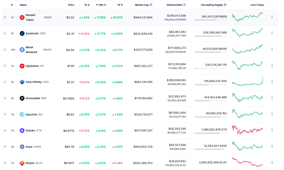 Các dự án khác trong top 100 như Mask Network (MASK), Optimism (OP), Axie Infinity (AXS), ImmutableX (IMX), Injective (INJ), Stacks (STX), Aave (AAVE), Klaytn (KLAY)… tăng trưởng từ 4-8%.