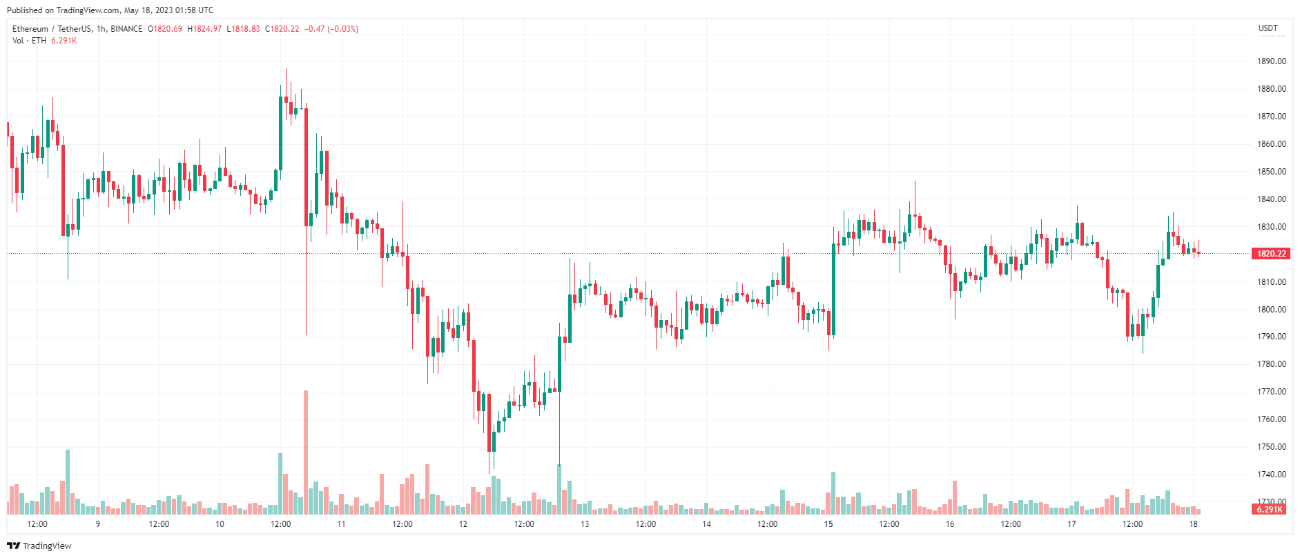 Ethereum (ETH) cũng đã phục hồi về trên $ 1.800. Sau khi chạm đáy cục bộ trong ngày tại $ 1.783, ETH đã quay đầu bật tăng chạm mức đỉnh tại $ 1.835 trước khi trở về quanh $ 1.820 vào thời điểm hiện tại, ghi nhận mức giảm 0,5% trong 24 giờ qua.