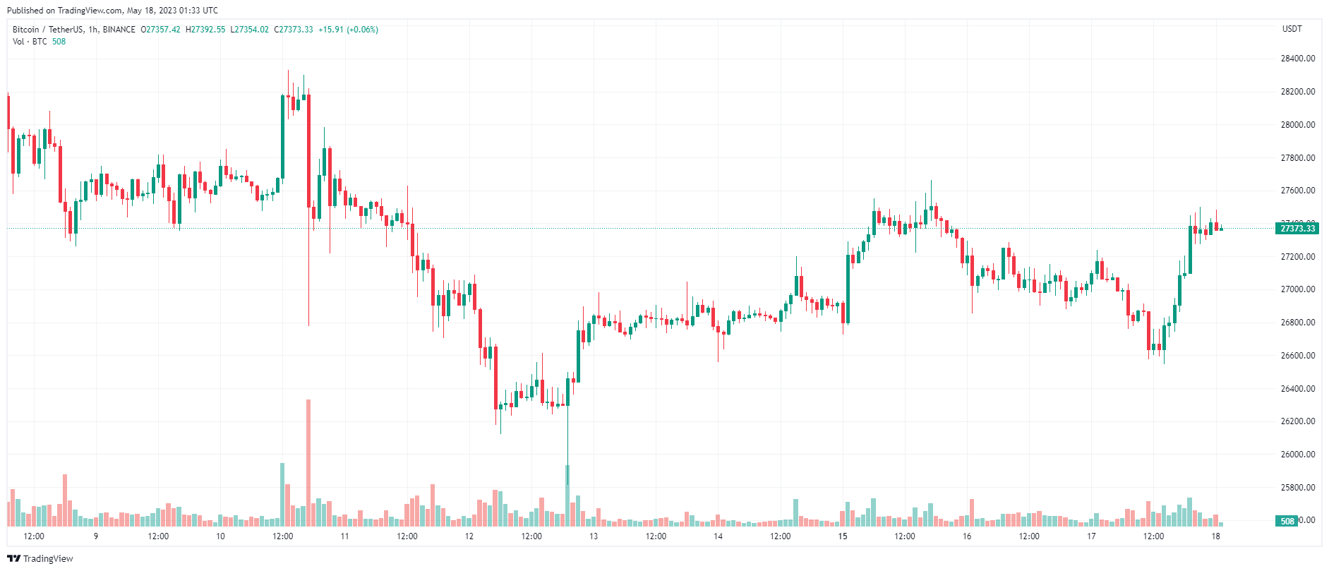 Bitcoin hồi phục về $ 27.500 khi nhà đầu tư hy vọng Hoa Kỳ có thể đạt được thoả thuận về vấn đề trần nợ.