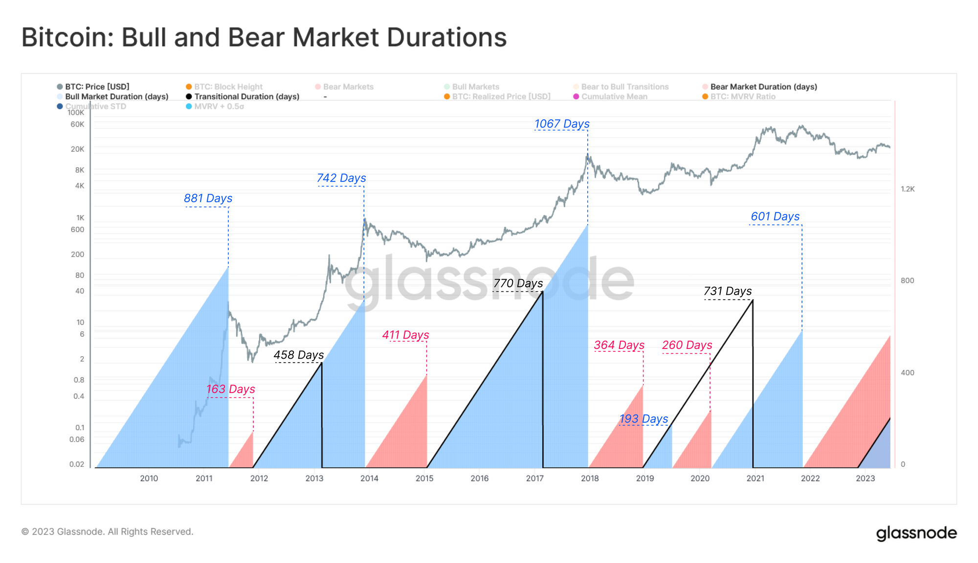 Giai đoạn đầu tiên là “thị trường giá lên”. Glassnode đã chọn chu kỳ đáy làm điểm bắt đầu cho giai đoạn này và đỉnh chu kỳ làm điểm cuối. Giai đoạn thứ hai sẽ là “thị trường giá xuống”, nó bắt đầu ở đỉnh và kết thúc ở đáy tiếp theo.