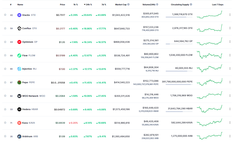 Theo sau đó là Conflux (CFX), Optimism (OP), Flow (FLOW), Injective (INJ), Pepe (PEPE), WOO Network (WOO) với mức tăng trưởng hơn 10%.