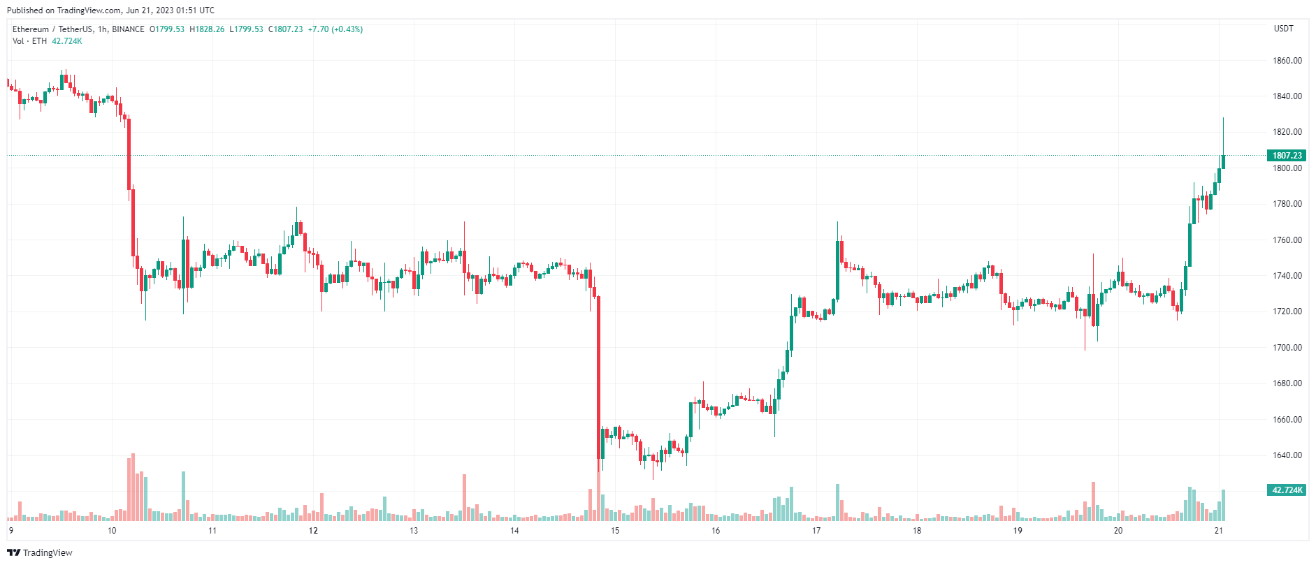 Ethereum (ETH) cũng đã thành công đòi lại khu vực $ 1.800, sau khi thiết lập mức đỉnh cục bộ tại $ 1.828 và hiện đang được giao dịch quanh $ 1.807, tăng hơn 4% trong 24 giờ qua.