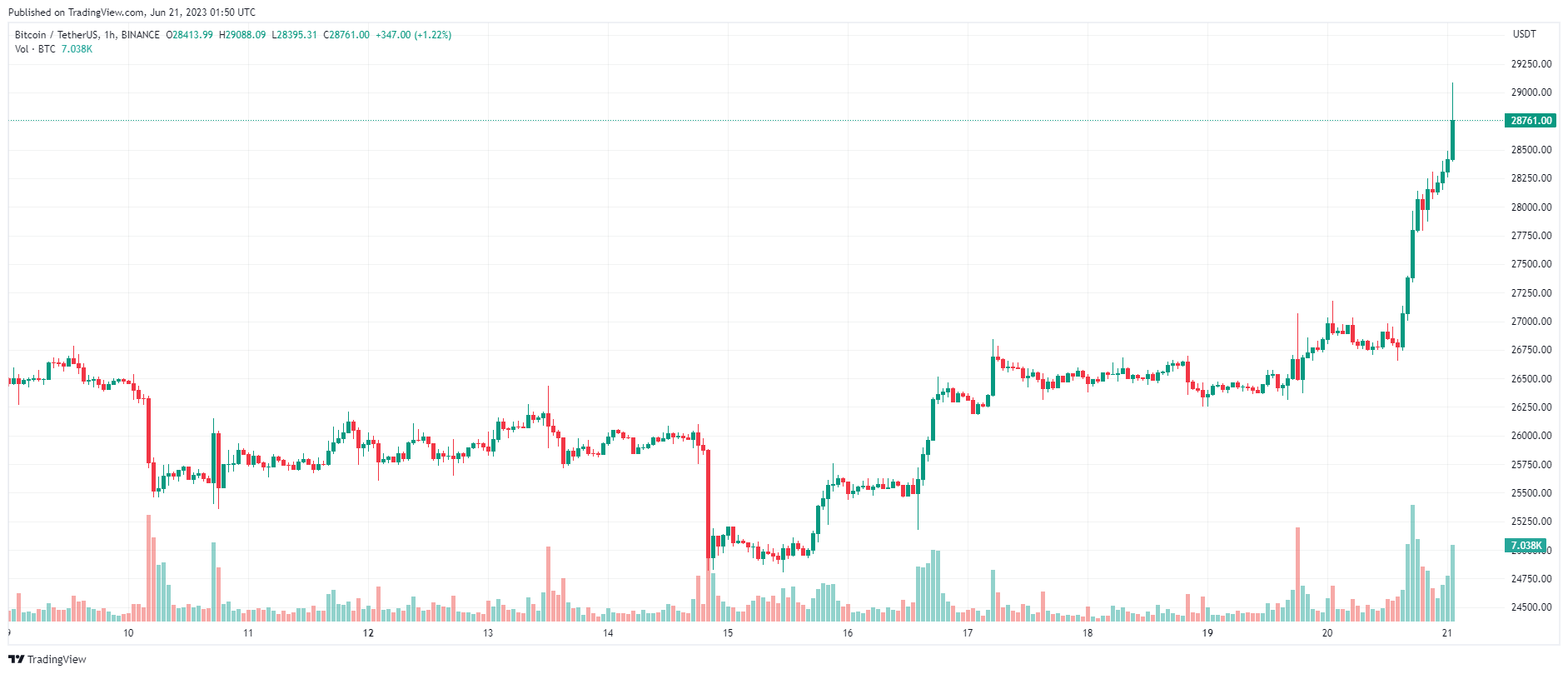 Bitcoin bật tăng hơn 7% trong ngày, thiết lập đỉnh cục bộ tại $ 29.088, mức cao nhất kể từ đầu tháng 5.