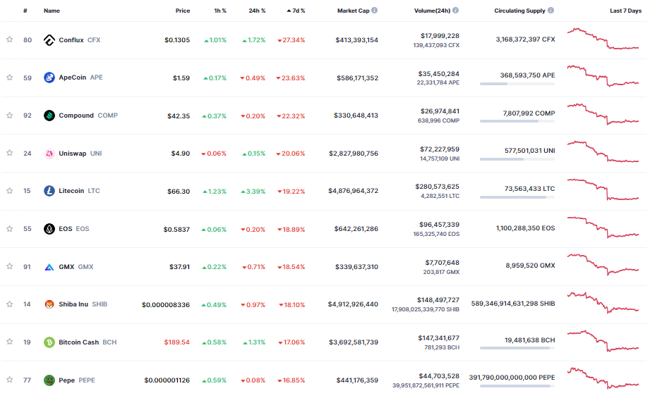 Nhiều dự án trong top 100 chì trong sắc đỏ, với Conflux (CFX), Apecoin (APE), Compound (COMP), Uniswap (UNI) bốc hơi hơn 20% giá trị trong tuần.