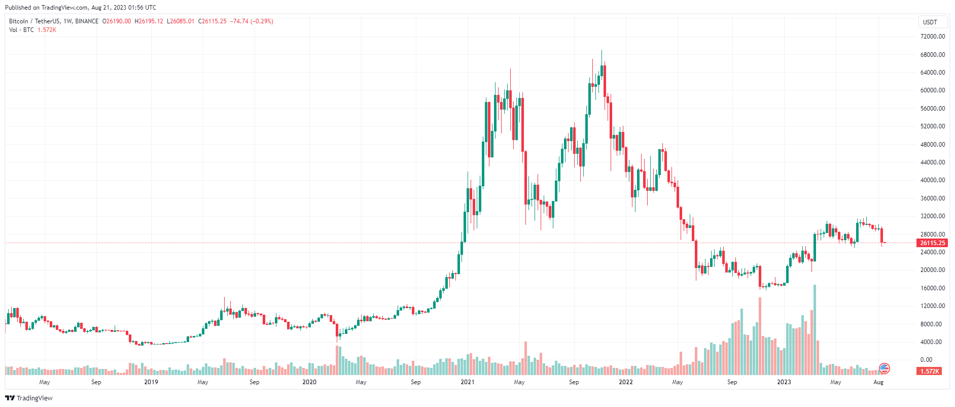 Bitcoin đóng tuần trong sắc đỏ tại $ 26.175 với mức giảm hơn 10%, ghi nhận một trong những tuần giảm điểm tồi tệ nhất kể từ đợt sụp đổ của FTX vào tháng 11/2022.
