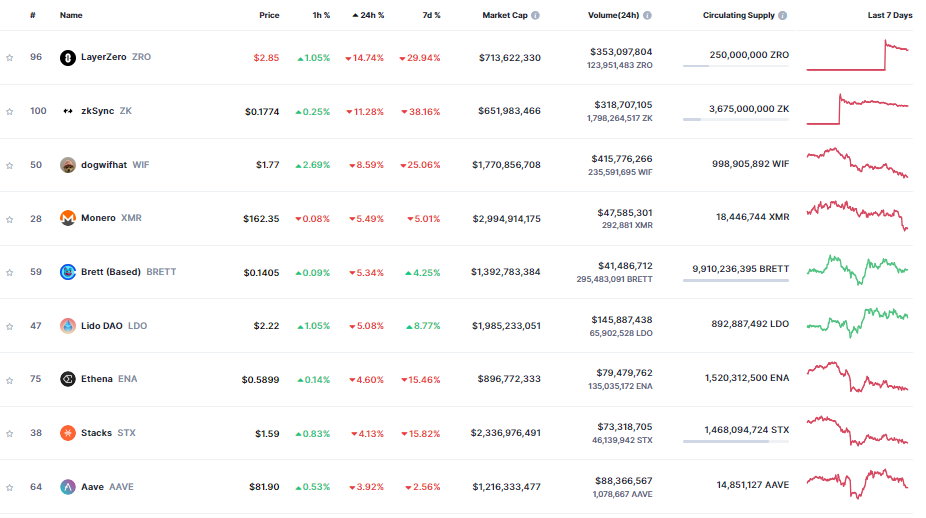 Dẫn đầu là LayerZero (ZRO) với mức giảm giá gần 15% trong ngày. Trên khung thời gian 7 ngày, ZRO đã mất đến 30% giá trị.
