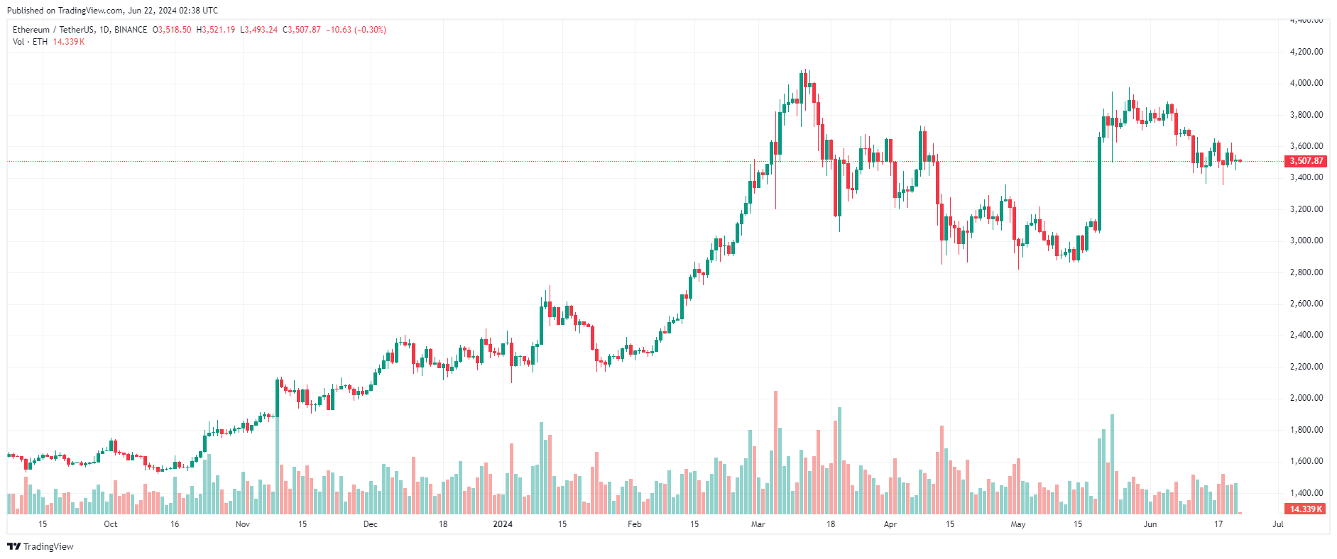 Phe bò Ethereum (ETH) đang cố gắng giữ giá ổn định quanh $ 3.500. Tài sản có vốn hoá lớn thứ 2 trên thị trường đã tăng nhẹ gần 0,2% trong 24 giờ qua và hiện đang được giao dịch quanh $ 3.510.