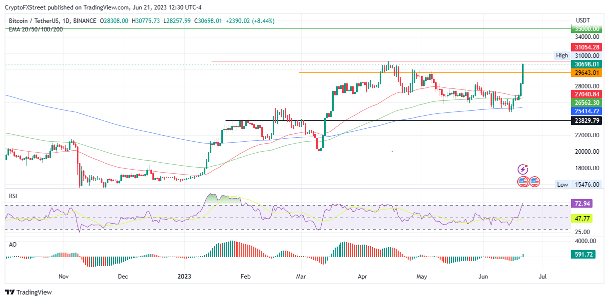 Sau khi vượt mốc $ 30.000, BTC đang hướng tới $ 31.000, cố gắng lấy lại mức đỉnh vào giữa tháng Tư. Một nến quyết định đóng cửa trên $ 31.000 có thể dọn đường cho đà tăng 15% hướng đến mục tiêu đầy tham vọng của các nhà phân tích là $ 35.000.