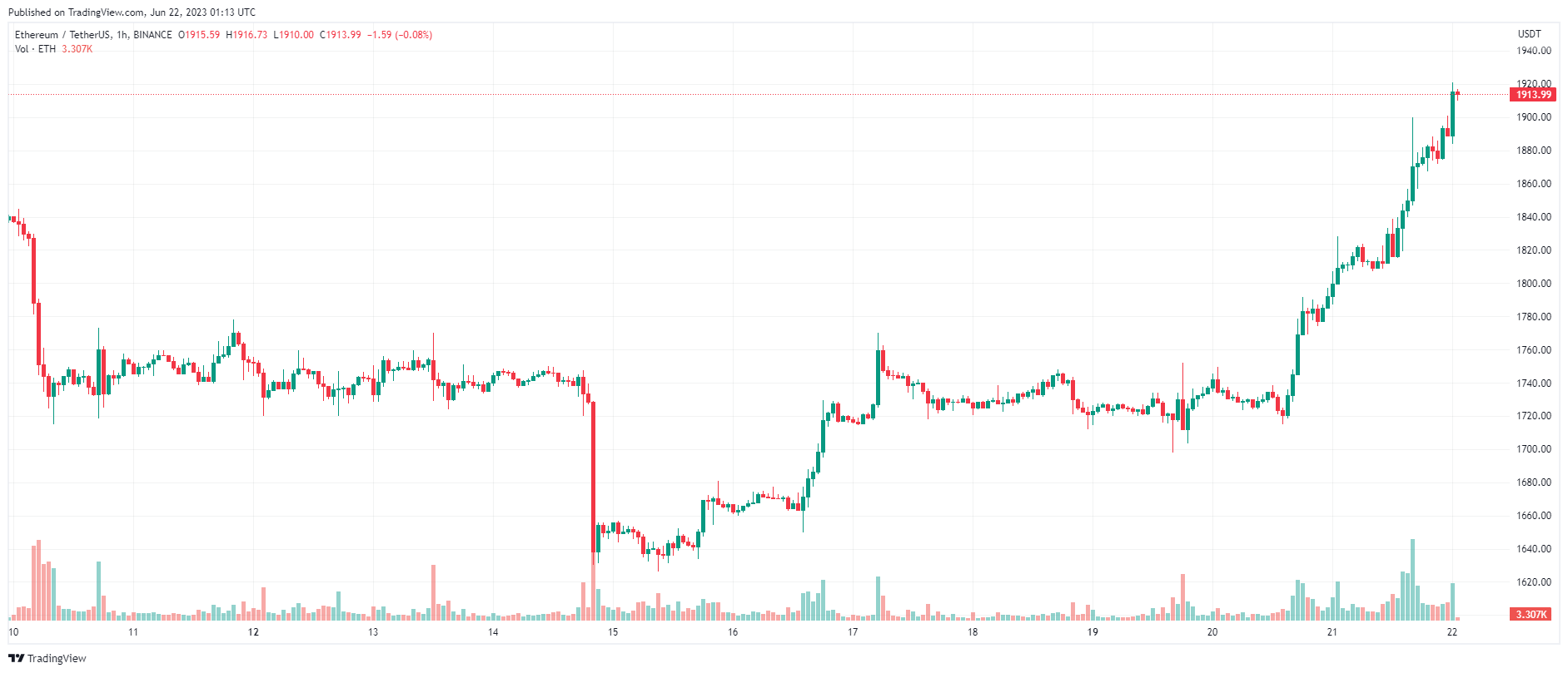 Ethereum (ETH) cũng vượt vùng $ 1.900, được hưởng lợi từ đà tăng mạnh mẽ của Bitcoin. Hiện token hợp đồng thông minh lớn nhất thị trường đang được giao dịch quanh $ 1.915, tăng hơn 5% trong ngày và hơn 16% trong tuần qua.