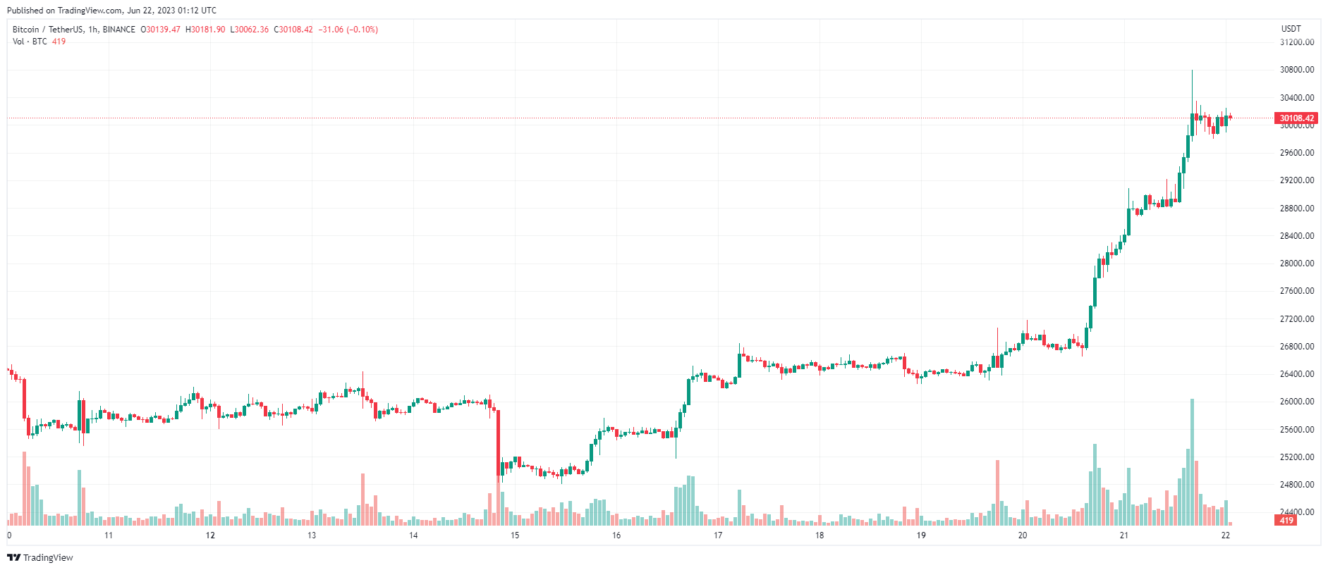 Bitcoin tiếp tục đà tăng mạnh vượt $ 30.000 trong bối cảnh các tổ chức đầu tư thể hiện sự quan tâm và công nhận đối với tài sản crypto hàng đầu.