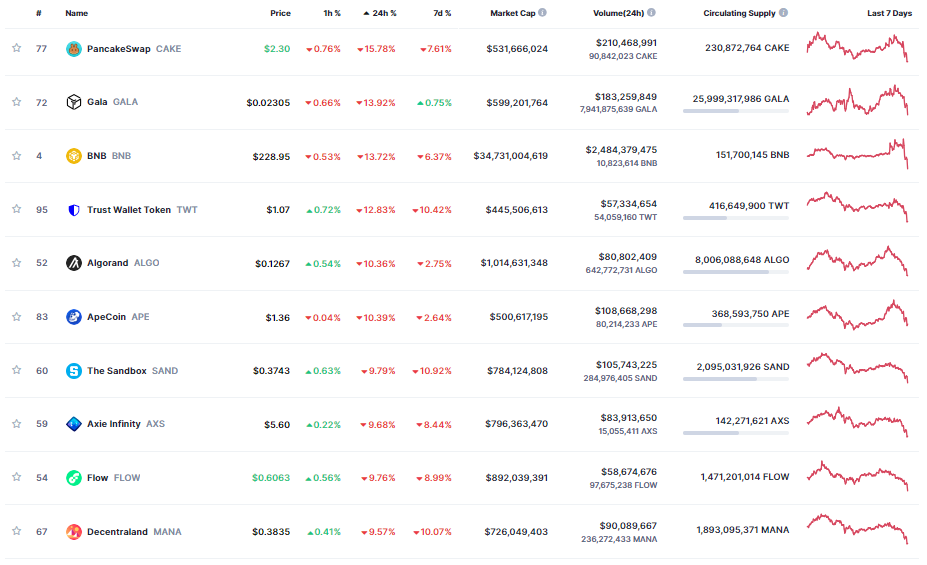 PancakeSwap (CAKE), Gala (GALA), BNB (BNB), Trust Wallet Token (TWT), Algorand (ALGO), Apecoin (APE) là những dự án lớn trong top 100 ghi nhận hoạt động kém nhất trong 24 giờ qua cùng mức giảm trên 10%.