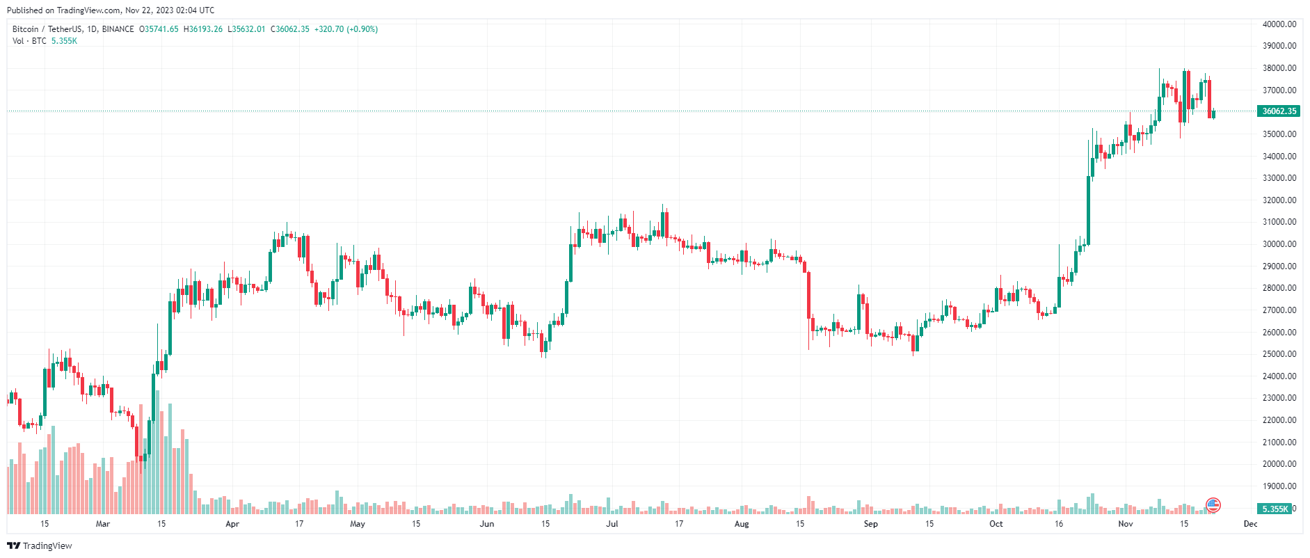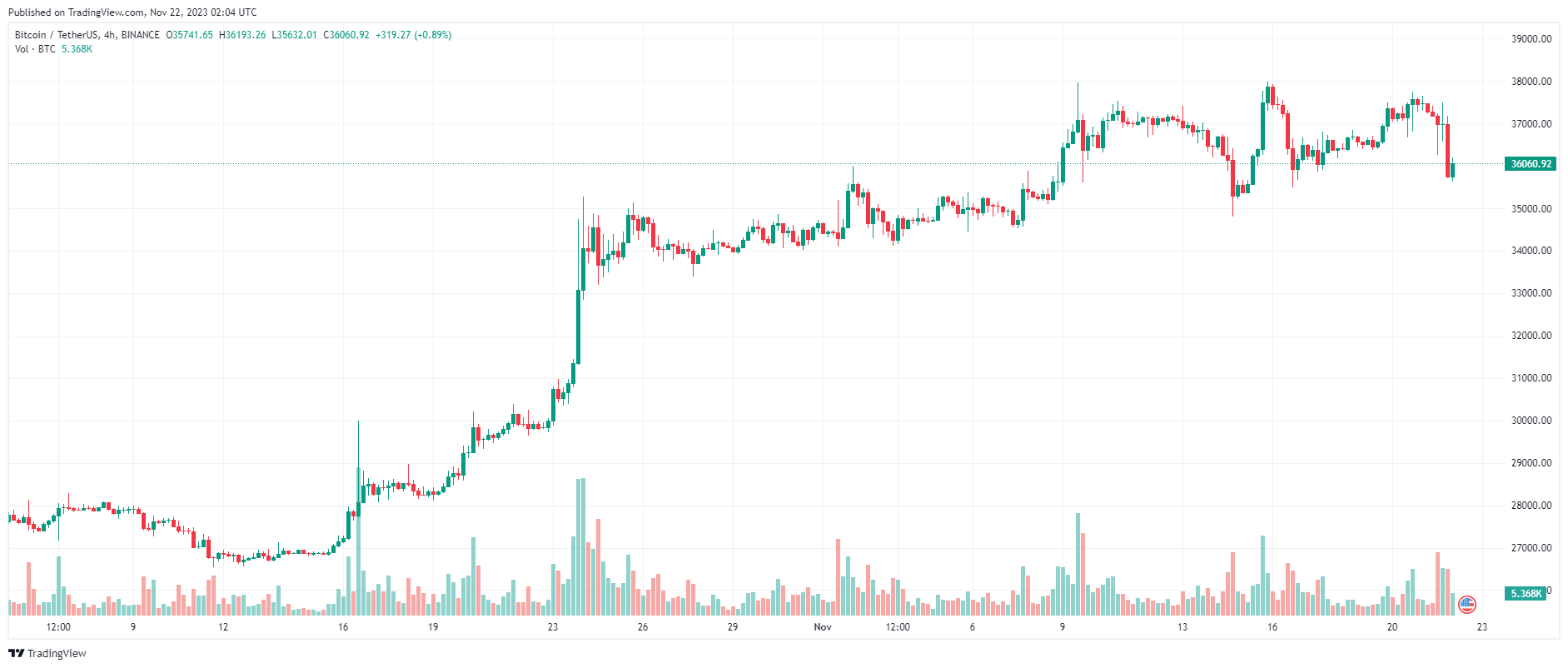 Bitcoin chứng kiến ngày giao dịch đầy biến động khi lao dốc về quanh $ 36.000 sau khi Bộ Tư Pháp Hoa Kỳ tổ chức họp báo công bố thoả thuận với Binance.