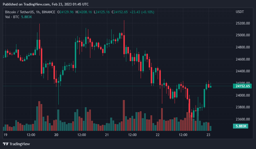 Bitcoin phục hồi về trên $ 24.000 sau khi chạm đáy cục bộ $ 23.574 trong đêm qua, sau khi Fed công bố biên bản cuộc họp gần nhất.