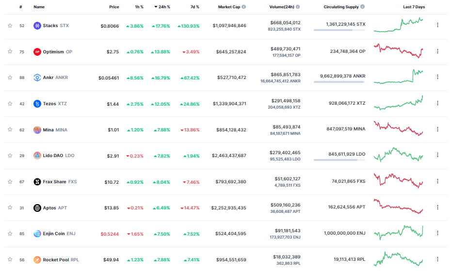 Các dự án khác như Ankr (ANKR), Optimism (OP), Enjin Coin (ENJ), Lido DAO (LDO), Frax Share (FXS), Aptos (APT), Mina (MINA)… đều ghi nhận khoản lãi từ 7-15%.