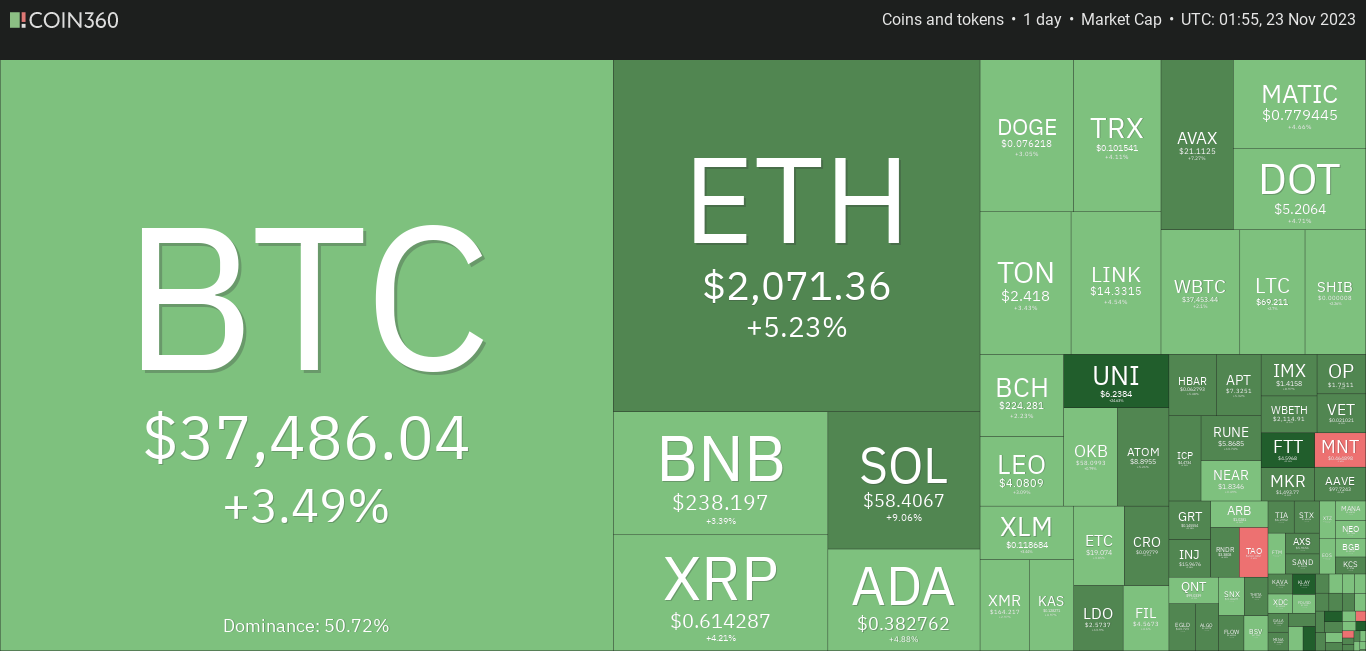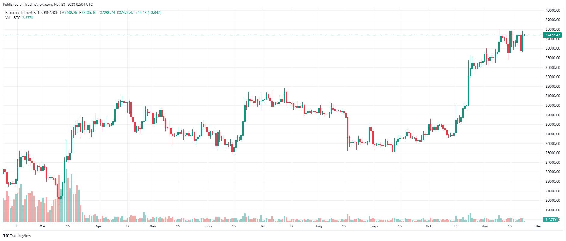 Giá Bitcoin phục hồi từ đợt điều chỉnh trong ngày 21/11 về $ 35.651 và đạt mức cao nhất trong ngày tại $ 37.861.