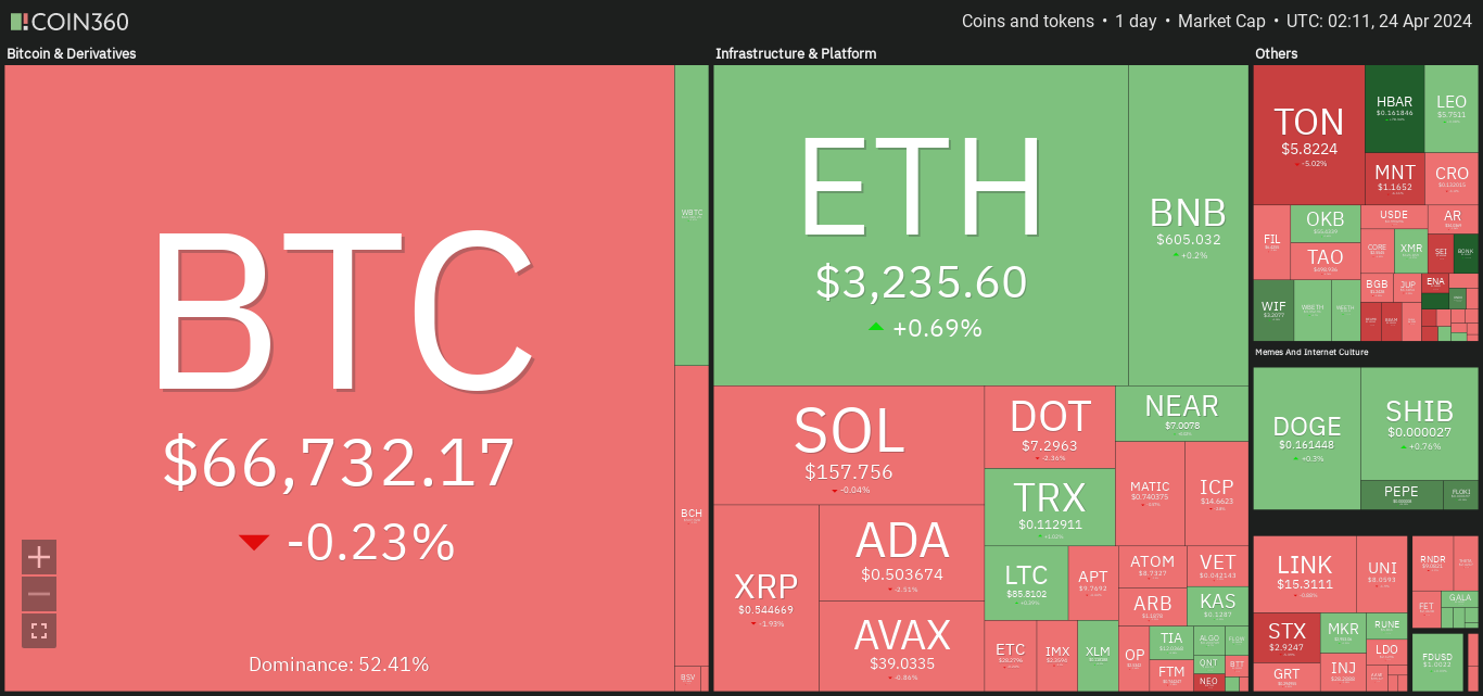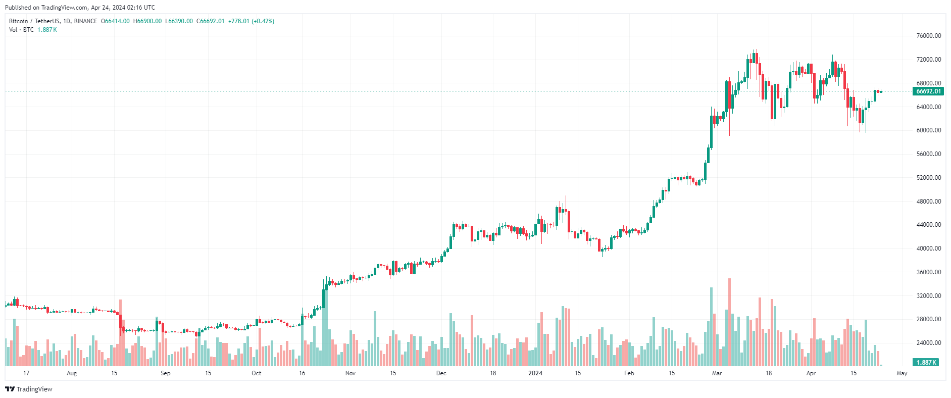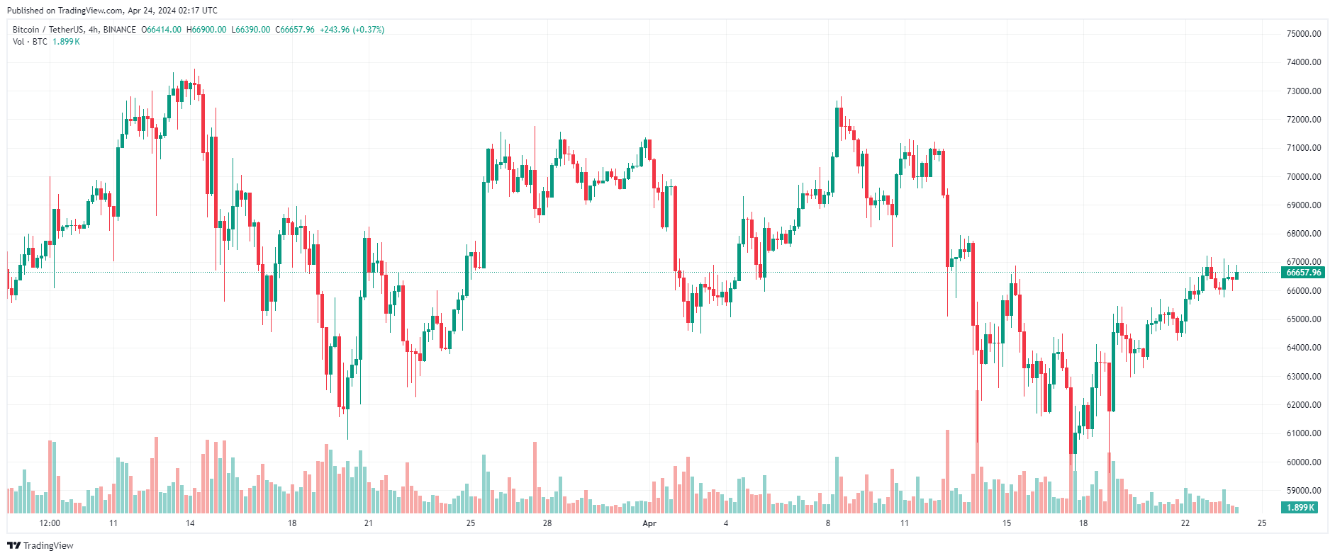 Thị trường đã phục hồi từ dưới $ 60.000 trong ngày 19/4, chạm đỉnh cục bộ trên $ 67.000. Tuy nhiên đà tăng dường như đã chững lại quanh khu vực này.
