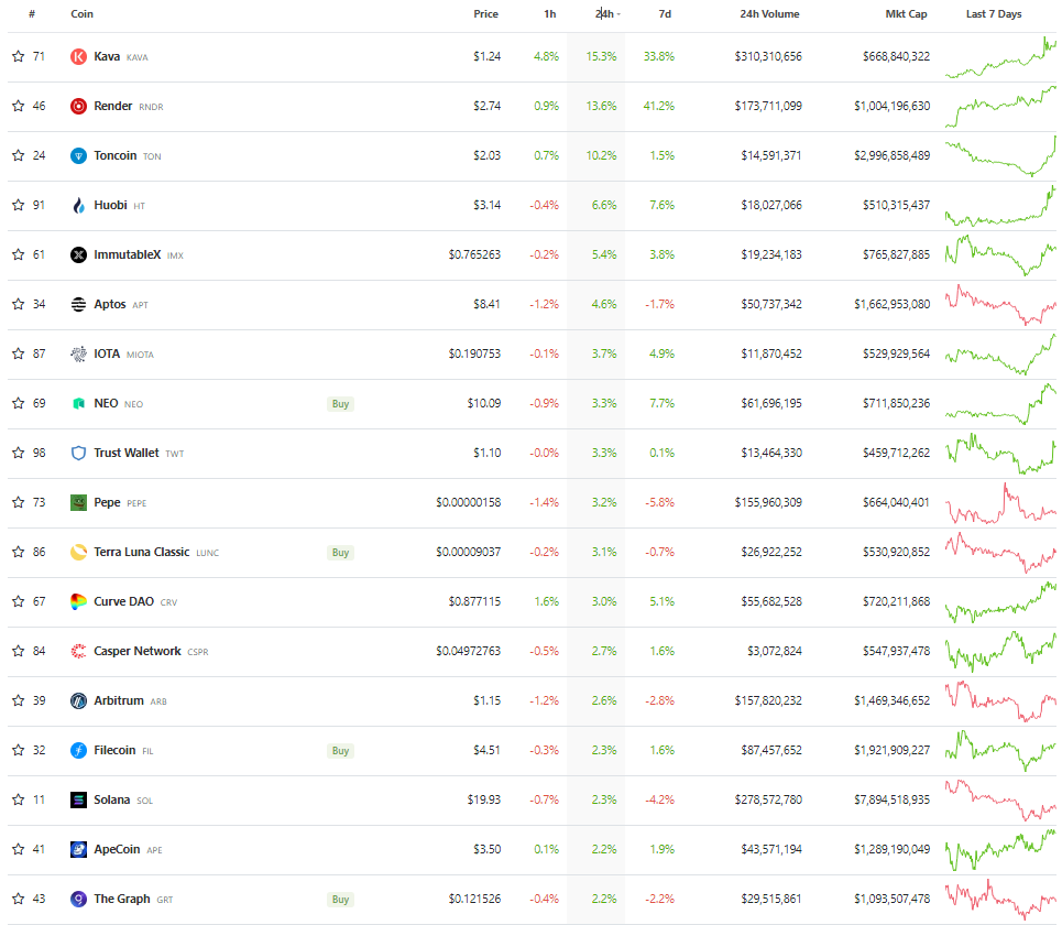 Trong top 100, phần lớn các altcoin đang chứng màu xanh, với chỉ một vài altcoin giảm giá nhẹ. Ở phía tăng giá, hiện có 3 altcoin đạt được mức tăng hai chữ số trong 24 giờ qua, gồm KAVA (+15%), RNDR (+13%), TON (+10%) trong khi các altcoin tăng giá còn lại đang ghi nhận mức lợi nhuận dao động từ 0,5-6%.
