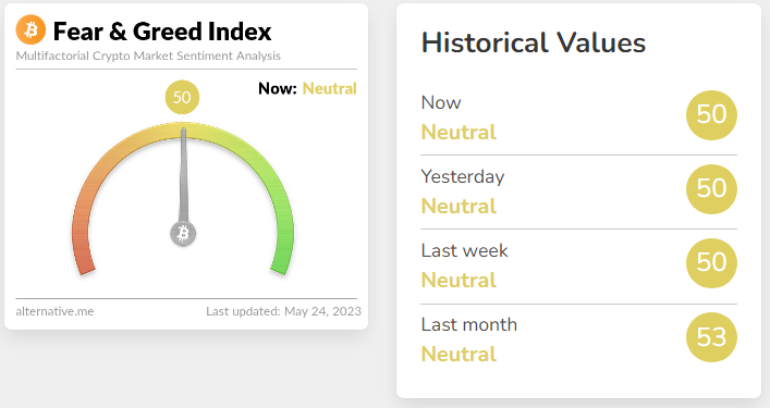 Tâm lý nhà đầu tư hiện đang trong vùng trung lập với chỉ số Tham lam và Sợ hãi hiện đang ở mức 50.