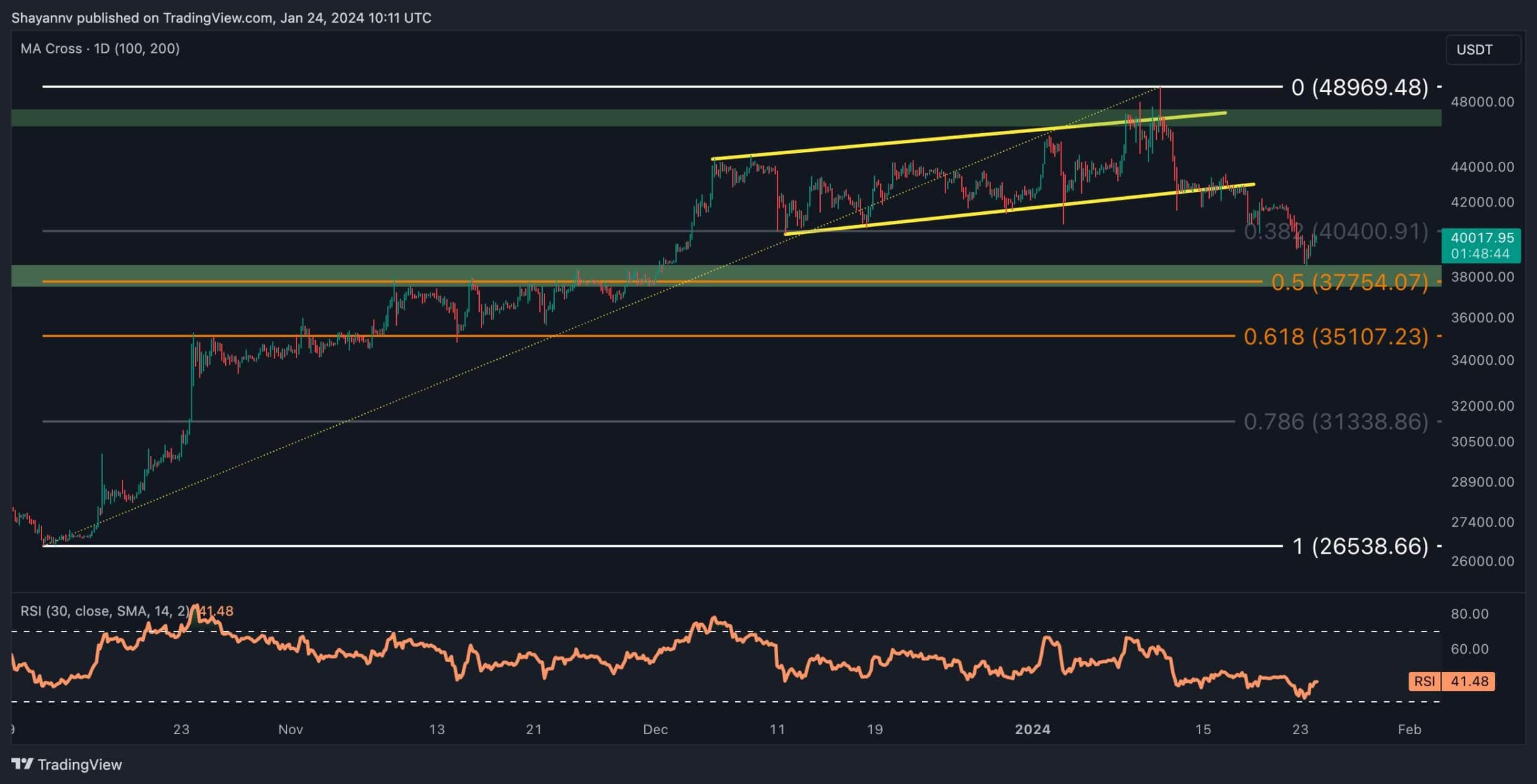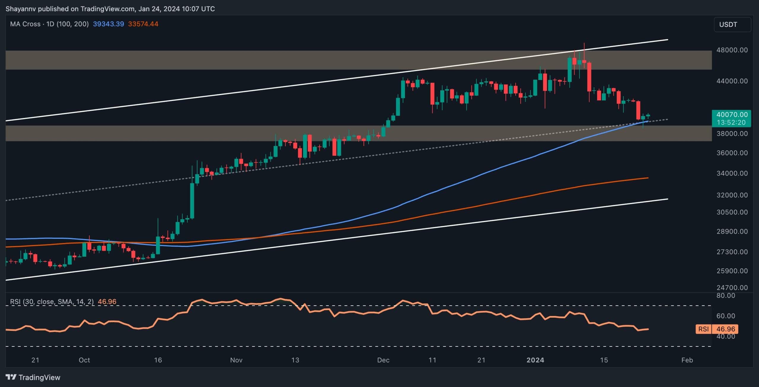 Trên biểu đồ hàng ngày, có thể thấy rõ rằng đợt điều chỉnh gần đây của Bitcoin đã kéo dài, dẫn đến sự sụt giảm mạnh. Tuy nhiên, đà giảm của mức thoái lui đã tạm thời bị dừng lại khi đạt đến phạm vi hỗ trợ quan trọng, được đánh dấu bằng ranh giới giữa của kênh tăng dần và đường trung bình động 200 ngày, quanh mức $ 39.000, mang lại sự hỗ trợ mạnh mẽ cho người mua.