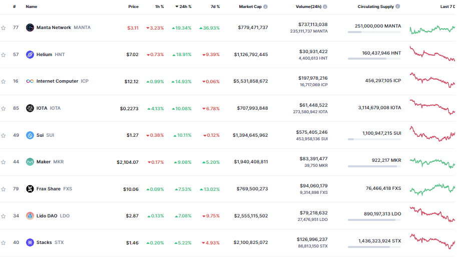 Manta Network (MANTA), Helium (HNT), Internet Computer (ICP), IOTA (IOTA), Sui (SUI) là những dự án có hoạt động nổi trội trong top 100, khi ghi nhận lợi nhuận trên 10% trong ngày. Trên khung thời gian 7 ngày, giá MANTA đã bật lên đến 36%.