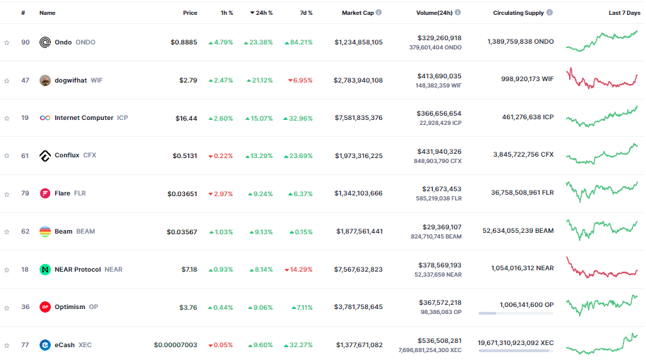 Ondo (ONDO) và memecoin dogwifhat (WIF) là hai dự án hoạt động tốt nhất với việc ghi nhận khoản lợi nhuận trên 20% trong ngắn hạn.