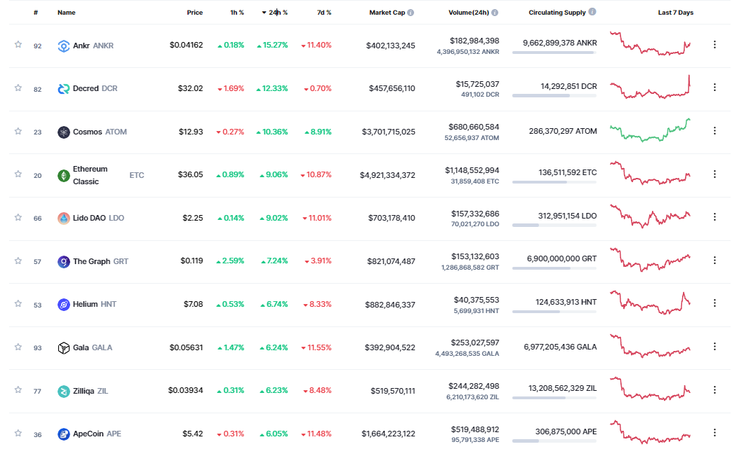 Dẫn đầu đà tăng của altcoin là ANKR với mức lợi nhuận 15% trong khoảng thời gian 24 giờ. Theo sát phía sau là DCR với +12%, ATOM +10%, ETC và LEO cùng tăng 9%.