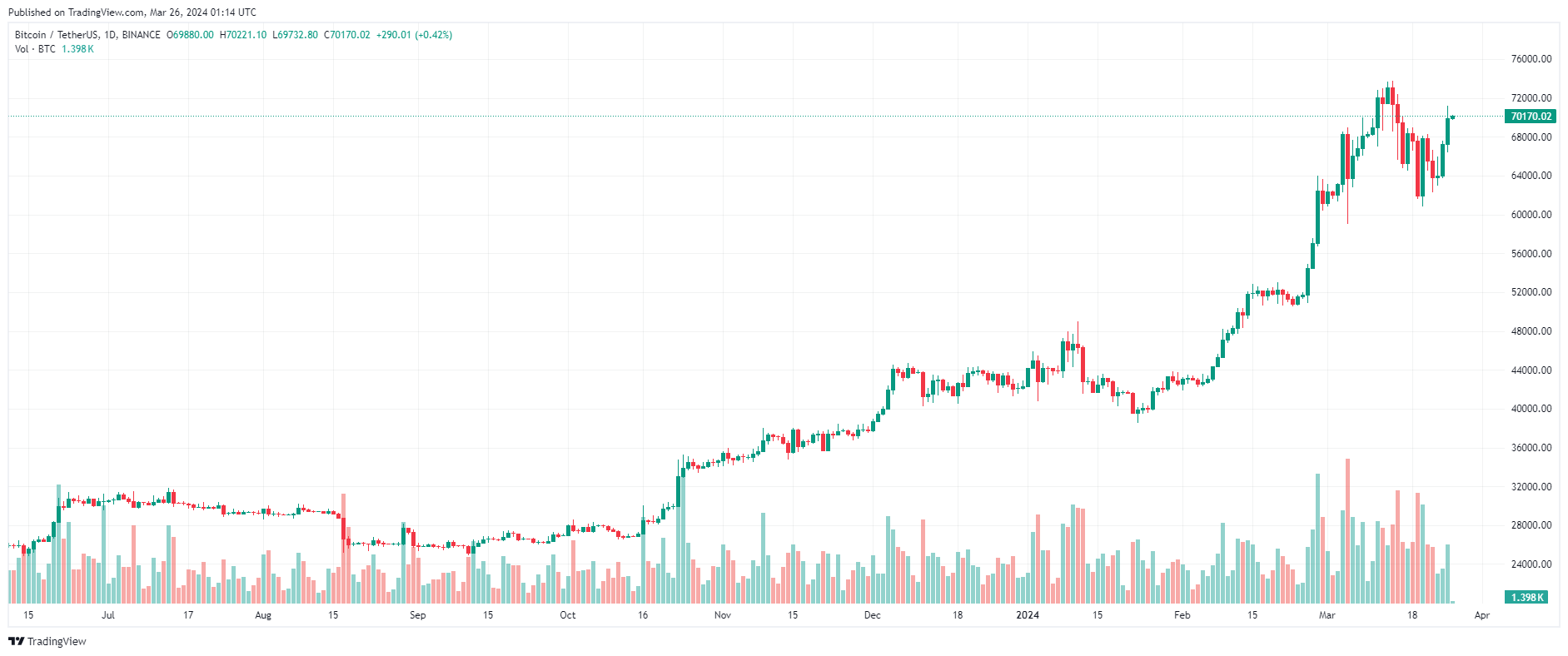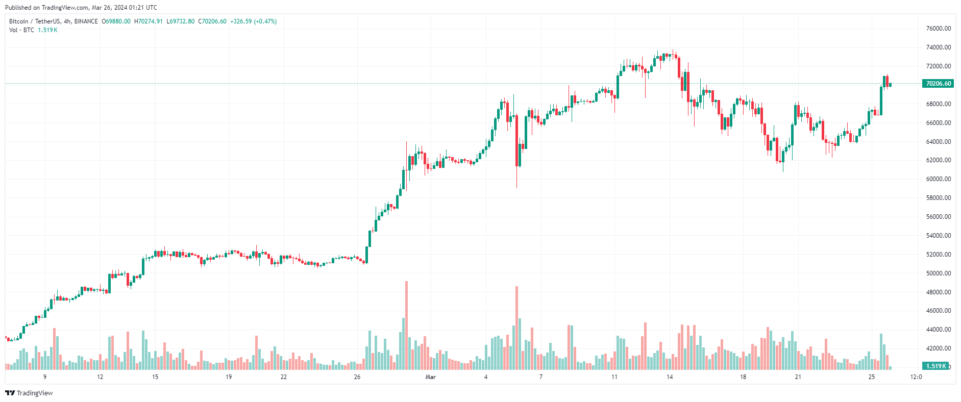 Thị trường đã tăng vọt $ 5.000 thiết lập đỉnh cục bộ quanh $ 71.150 mức cao nhất kể từ khi điều chỉnh mạnh vào ngày 15/3.