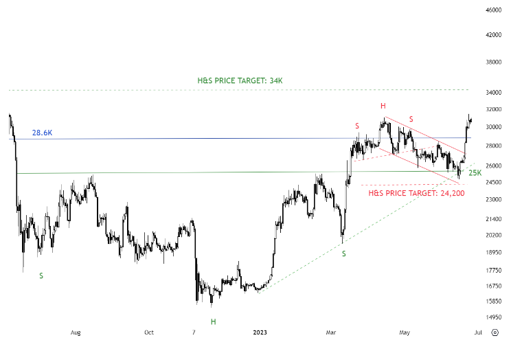 Phân tích của ông dựa trên mô hình vai đầu vai (H&S), cho thấy tâm lý lạc quan mạnh mẽ trên thị trường sau khi breakout khỏi kênh.