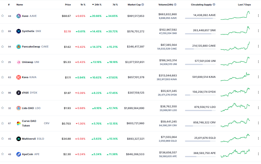 Pepe (PEPE) cũng nổi lên như một trong những coin dẫn đầu thị trường trong tuần này, tăng 64,7% trong vòng bảy ngày. Xét về khối lượng giao dịch trong khung thời gian một ngày, PEPE chiếm vị trí thứ 11 hiện nay trong số các loại tiền điện tử được giao dịch hàng đầu. Khối lượng giao dịch của PEPE vào Chủ nhật lên tới khoảng 312 triệu đô la và token đang giao dịch ở mức 0,0000016 đô la vào thời điểm viết bài. Ngoài ra, tài sản tiền điện tử của nền tảng Defi Aave đã chứng kiến mức tăng 47,1% trong tuần này. Aave hiện đứng thứ 9 về khối lượng giao dịch toàn cầu.