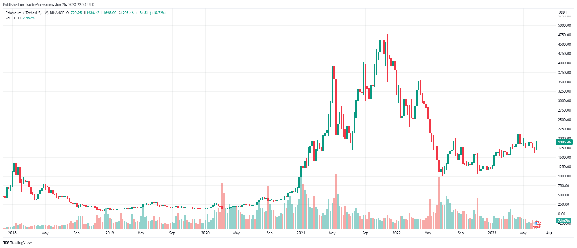 Tương tự Bitcoin (BTC), Ethereum cũng ghi nhận tuần tăng trưởng mạnh mẽ khi đóng tuần trong sắc xanh quanh khu vực $ 1.900. Đây cũng là tuần mà ETH có hoạt động tốt nhất kể từ khi vượt qua ngưỡng $ 2.100 vào tháng 4/2023.