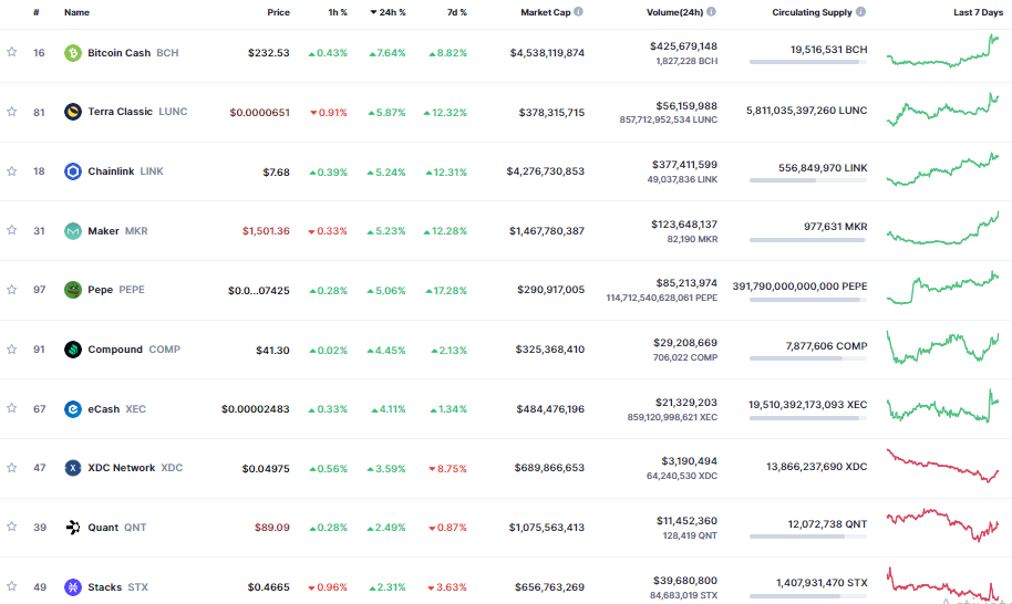 Các dự án lớn trong top 100 như Bitcoin Cash (BCH), Terra Classic (LUNC), Maker (MKR), Chainlink (LINK), Pepe (PEPE), Compound (COMP), eCash (XEC), XDC Network (XDC), Quant (QNT), Stack (STX), KuCoin Token (KCS), Bitcoin SV (BSV), Ethereum Classic (ETC), Monero (XMR)… phục hồi từ 2-7% giá trị.