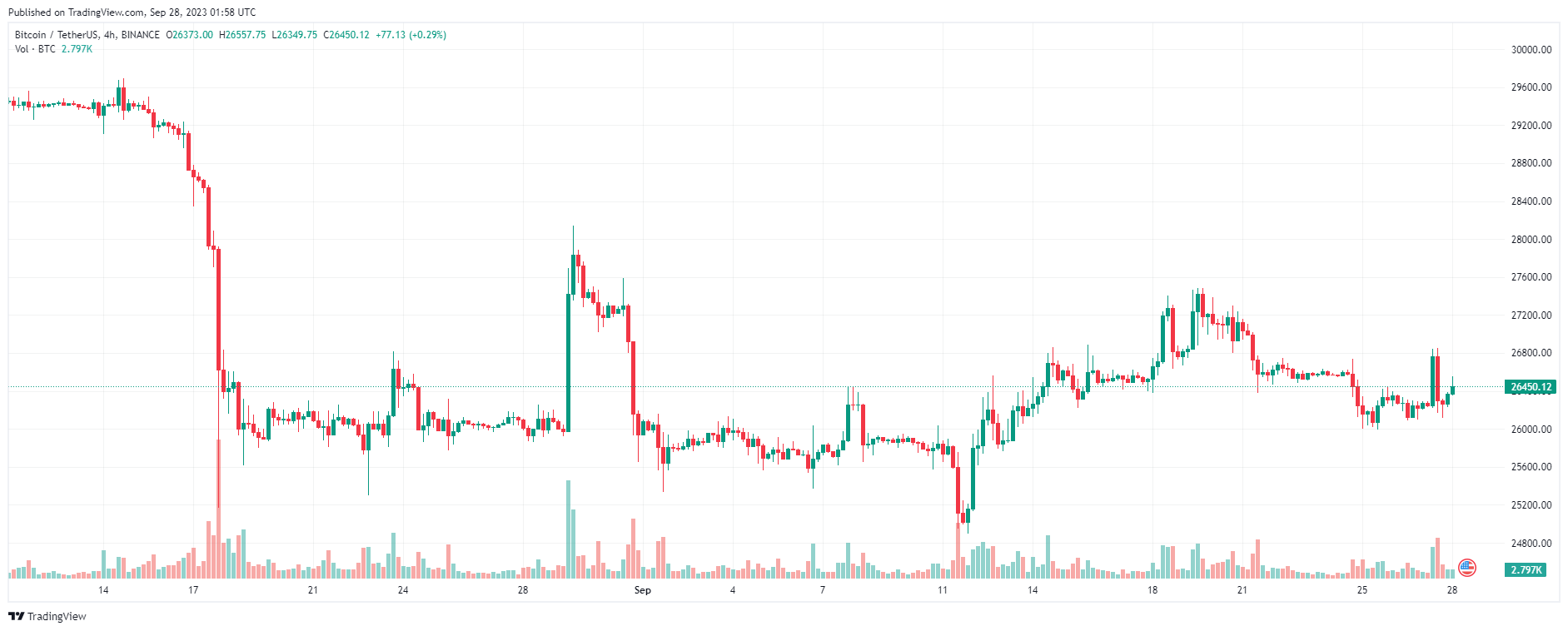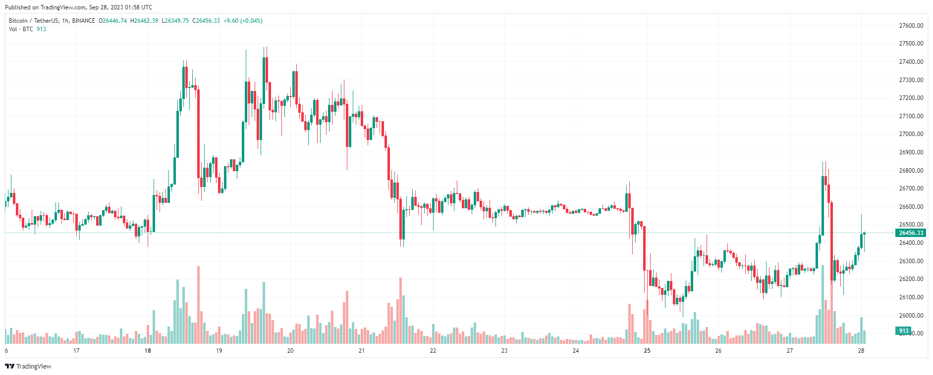 Bitcoin bất ngờ bật tăng vào đầu ngày hôm qua, thiết lập đỉnh cục bộ tại $ 26.850.