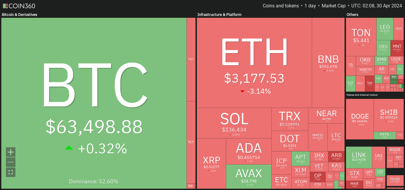 Bitcoin (BTC) vẫn không thể vượt $ 64.000, Ethereum (ETH) giảm điểm sau khi các quỹ Bitcoin và Ether ETF giao ngay tại Hồng Kông chính thức đi vào giao dịch.
