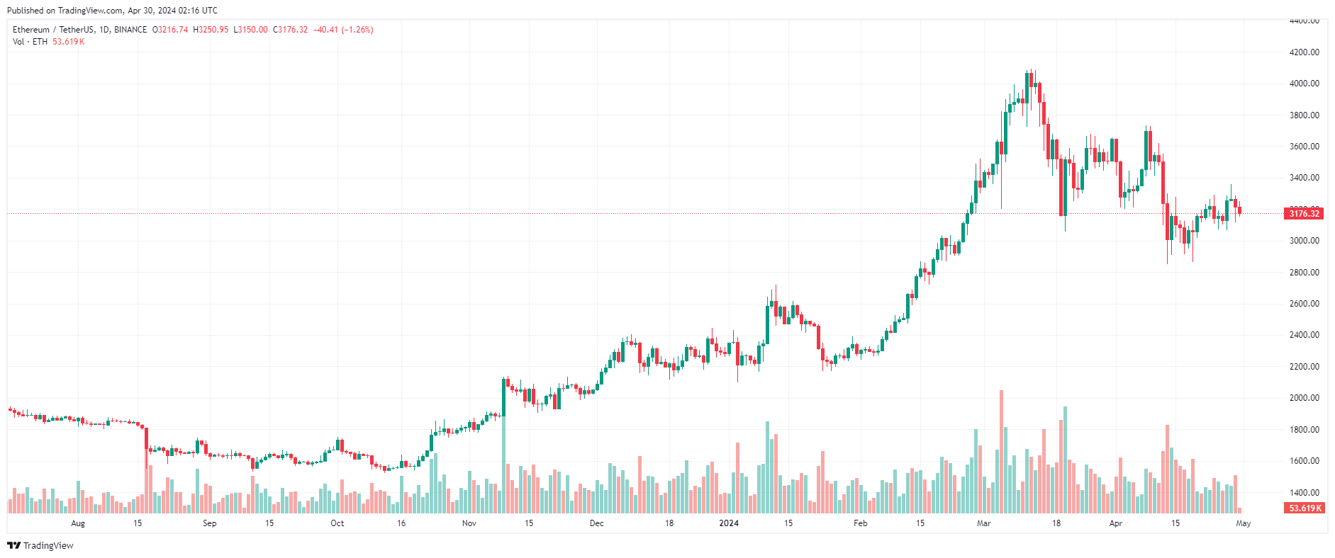 ETH đã không thể giảm gần 3% trong 24 giờ qua và hiện đang được giao dịch quanh $ 3.180.