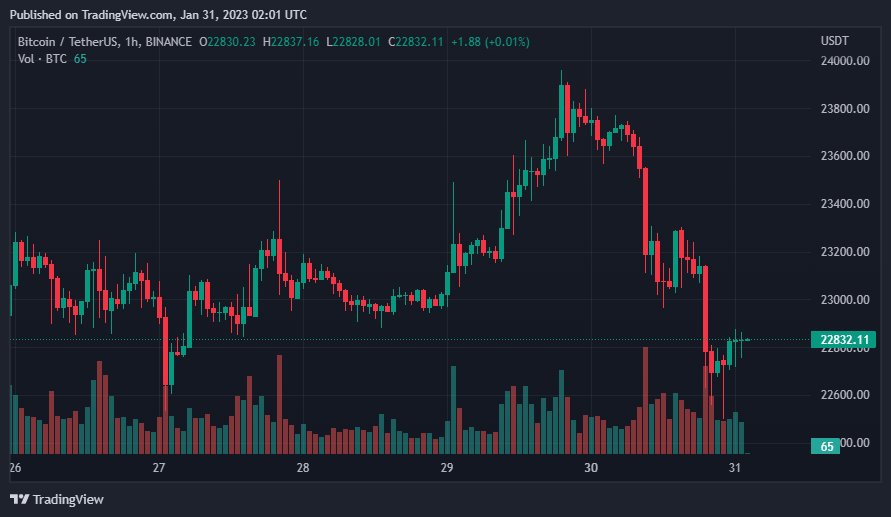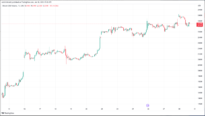 Dữ liệu từ TradingView cho thấy BTC/USD đã tiến sát $ 24.000 vào ngày 29/1, tuy nhiên đà tăng dường như đã bị chặn lại sau đó, khi BTC chứng kiến đợt điều chỉnh về dưới $ 23.000.