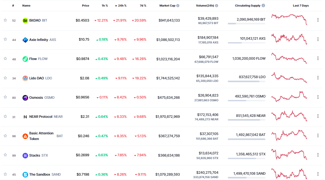 Các dự án khác như Axie Infinity (AXS), Flow (FLOW), Lido DAO (LDO), Osmosis (OSMO), NEAR Protocol (NEAR), Basic Attention Token (BAT), Stacks (STX), The Sandbox (SAND)… đều chìm trong sắc đỏ, với khoản lỗ từ 7-9%.