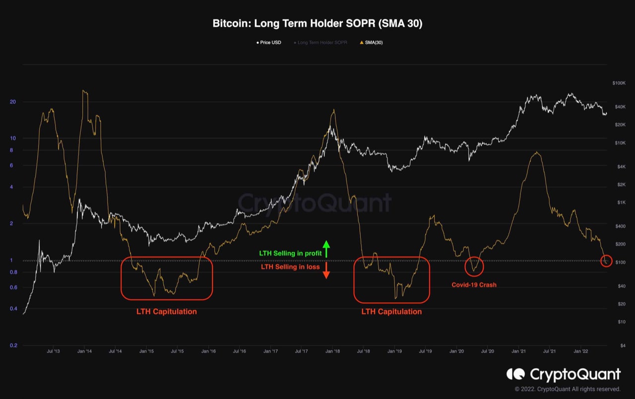 Nhận xét về biểu đồ Tỷ lệ lợi nhuận đầu ra chi tiêu (SOPR) của những hodler dài hạn, Edris đã so sánh với các điều kiện xảy ra trước các lần chạm đáy thế hệ trước trong lịch sử Bitcoin, bao gồm thị trường gấu năm 2014 và 2018, cũng như sự cố thị trường chéo COVID-19 vào tháng 3 năm 2020.