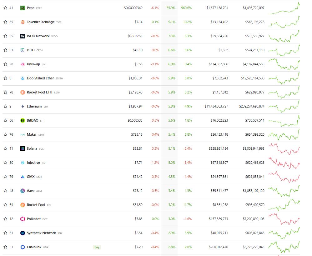 Về phía altcoin, phần lớn trong top 100 đang chứng kiến sắc xanh với PEPE dẫn đầu cuộc đua sau khi tăng điên cuồng khoảng 1.000% trong tuần qua. Vào thời điểm viết bài. memecoin này vẫn đang kiếm được hơn 50%. Điều này giúp nó bỏ xa những coin tăng giá khác ở phía sau vì token tăng giá thứ hai chỉ kiếm được khoảng 9% trong ngày và các token xanh khác chỉ ghi nhận mức lãi trong khoảng 0,5-7% trong cùng khoảng thời gian.