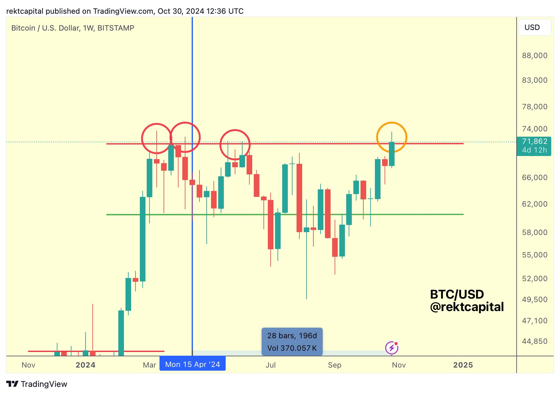 Trader và nhà phân tích Rekt Capital cho biết mức đóng cửa hàng tuần sẽ cung cấp thông tin quan trọng về sức mạnh của động thái mới nhất của BTC.