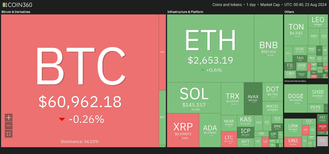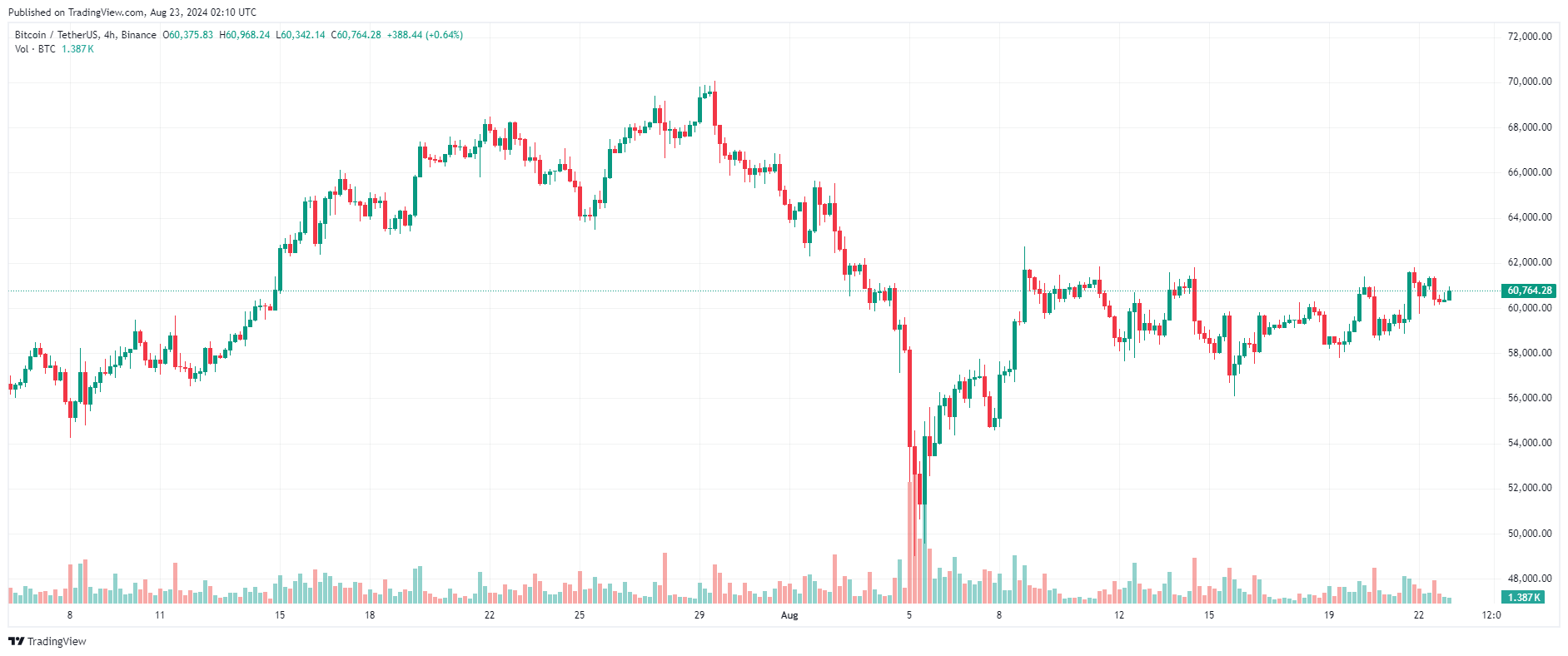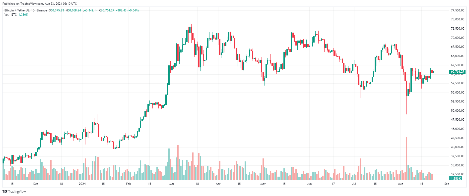 Sau khi tăng vọt chạm đỉnh cục bộ tại $61.820 vào ngày 21/08, Bitcoin đã khép lại ngày hôm qua trong sắc đỏ.
