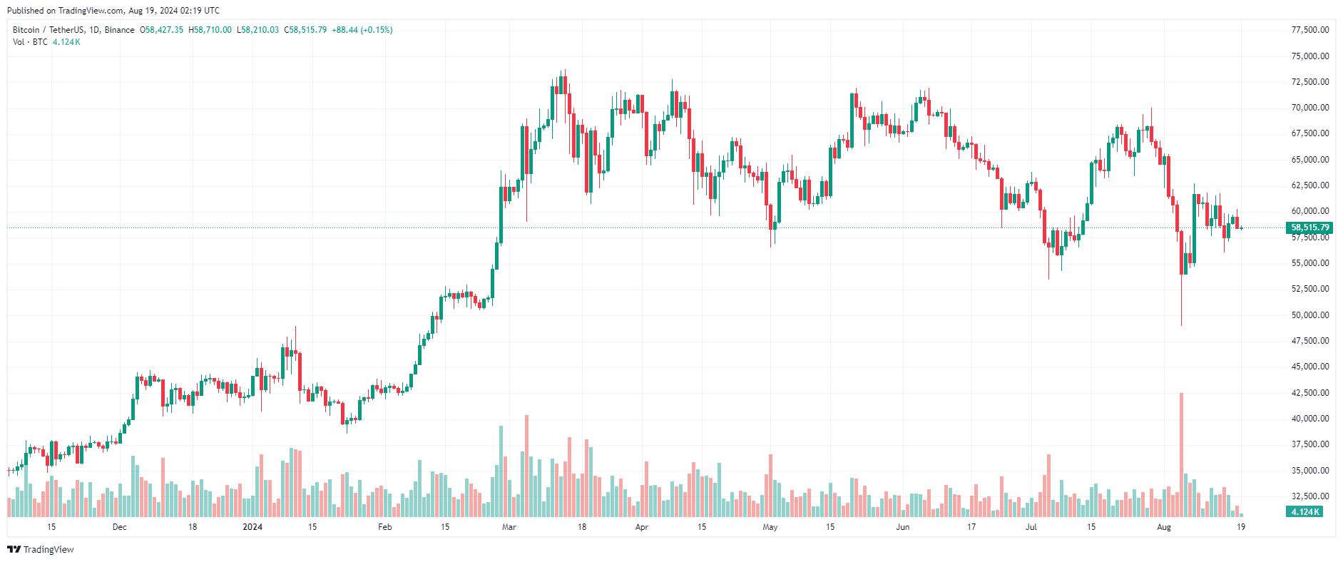 Hiện tại, tài sản hàng đầu đang được giao dịch quanh mốc $58.570, giảm 1,5% giá trị so với 24 giờ trước đó.