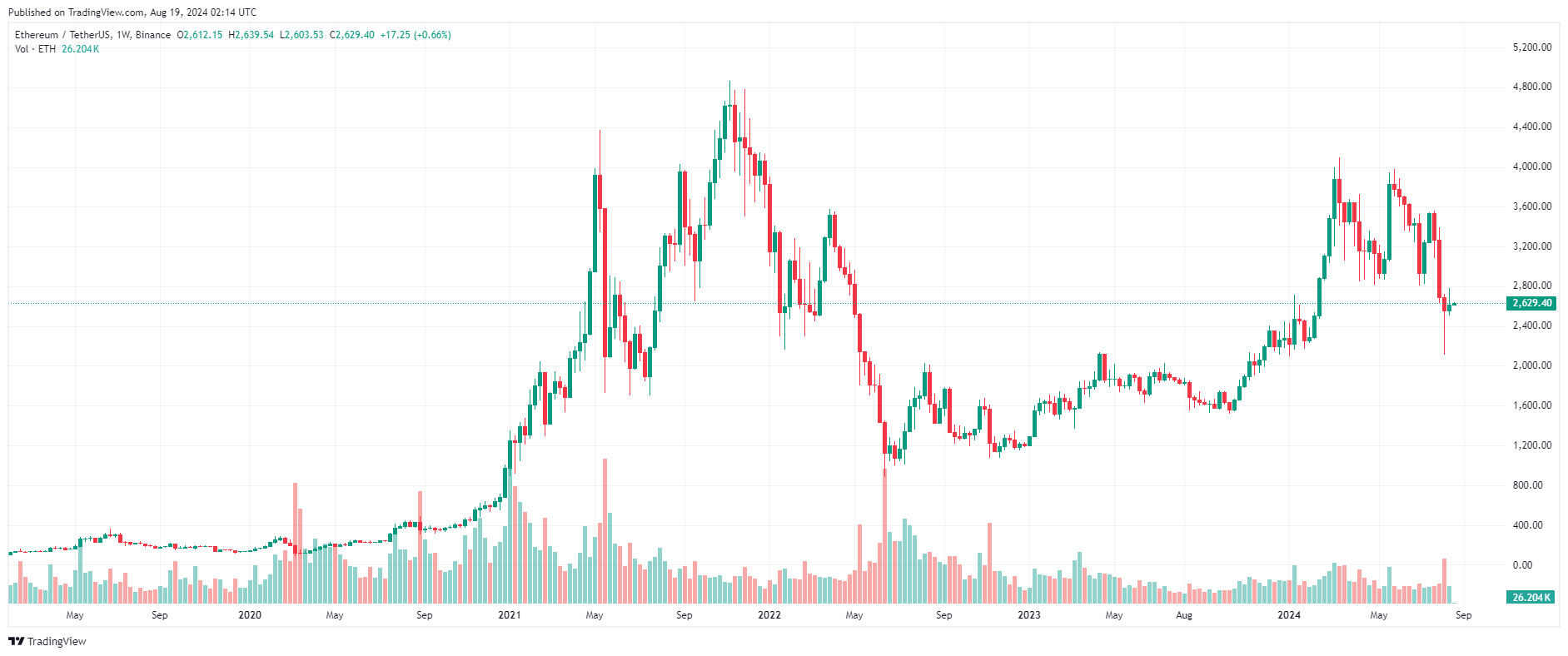 Tài sản có vốn hóa lớn thứ hai trên thị trường đã nỗ lực khép lại tuần qua trong sắc xanh với mức tăng trưởng hơn 2%, và hiện đang được giao dịch ở mức $2.630, tăng nhẹ gần 1% trong 24 giờ.