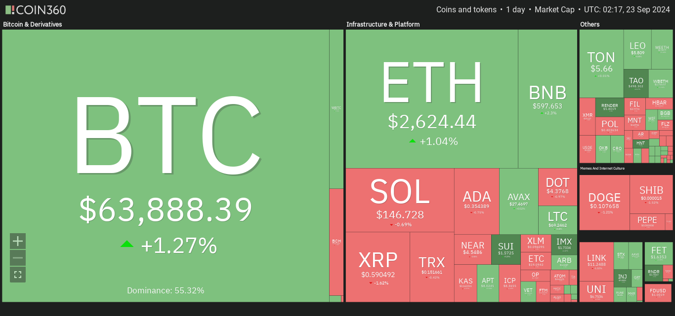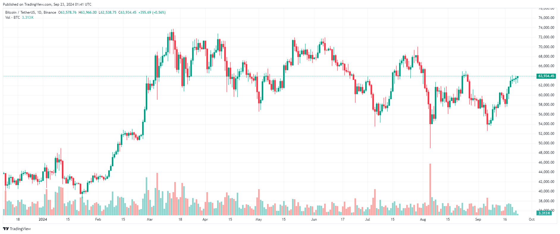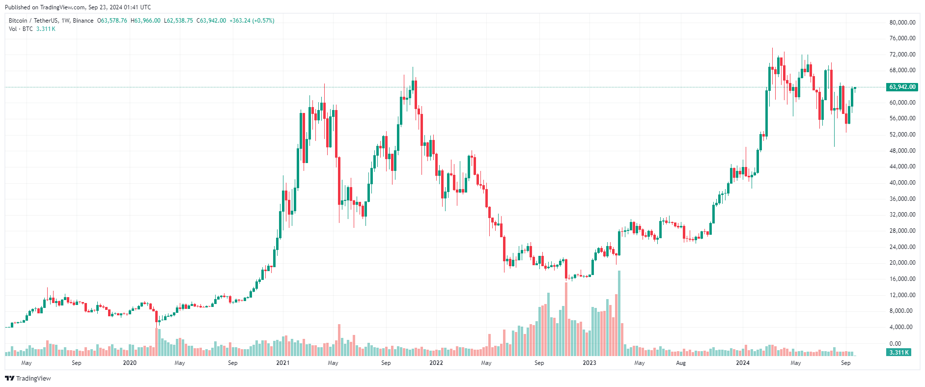 Bitcoin tiếp tục phục hồi trong tuần qua khi bật tăng hơn 7%, tiến sát khu vực $64.000 khi liên tục thiết lập đỉnh mới trong tháng 9.