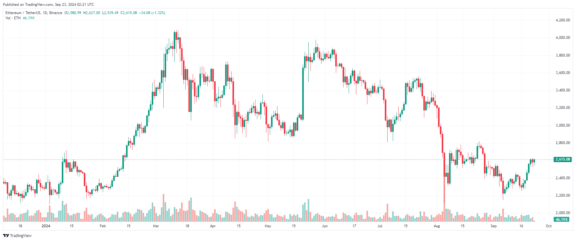 Tài sản có vốn hoá lớn thứ 2 trên thị trường cũng đã nỗ lực vượt $2.600 và ETH hiện đang được giao dịch quanh mốc $2.615, tăng nhẹ gần 1% trong ngày.