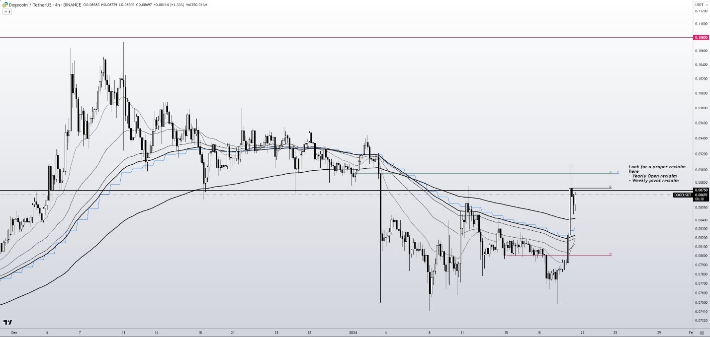 Phân tích biểu đồ DOGE 4 giờ của Skew đã tiết lộ “pump tốt sau khi tạo tài khoản XPayments”, cho thấy thị trường đang suy đoán về việc X có thể tích hợp Dogecoin làm tùy chọn thanh toán. Bất chấp động lực tích cực, Skew nhấn mạnh để có xu hướng tăng bền vững, DOGE cần “lấy lại đúng trục 1W (0,0875 đô la) và mở năm sau đó”.