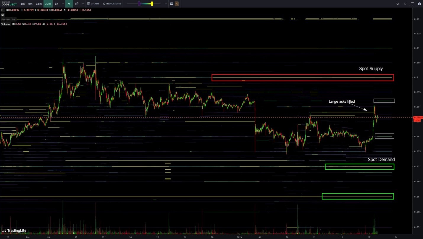 Trên thị trường giao ngay DOGE Binance, Skew nhấn mạnh hình thành phạm vi giá mới, lưu ý vùng cầu giao ngay đáng kể khoảng 0,07 đô la và tường cung lớn ở mức 0,1 đô la. Skew chỉ ra: